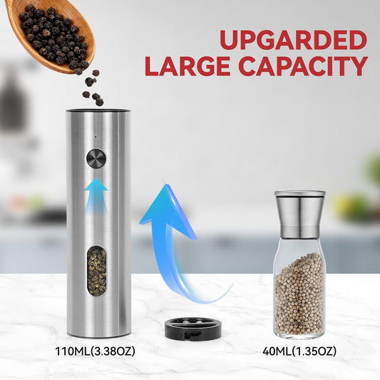 Electric Salt and Pepper Grinder- Upgraded 110ml Larger Capacity Electric Saltand Pepper Grinder Set with Rechargeable Base with LED Light & 5 Adjustable Coarseness, Ideal for Kitchen, Outdoor, BBQ